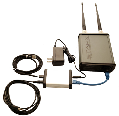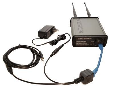 The STARX Transceiver Kit includes the accessories shown below: AC/DC adapter, 3.5mm audio cable, breakout Y-cable (for audio in/out and DC power), and a short (6") RJ45 interface cable . If needed, a much longer customer-provided Cat5 interconnect cable can be used to connect the outdoor transceiver to the optional STARX Indoor Unit. This cable can be up to 150' long when used with the IDU for USB connections to the STARX transceiver, or over 200' if used only for DC power and audio.